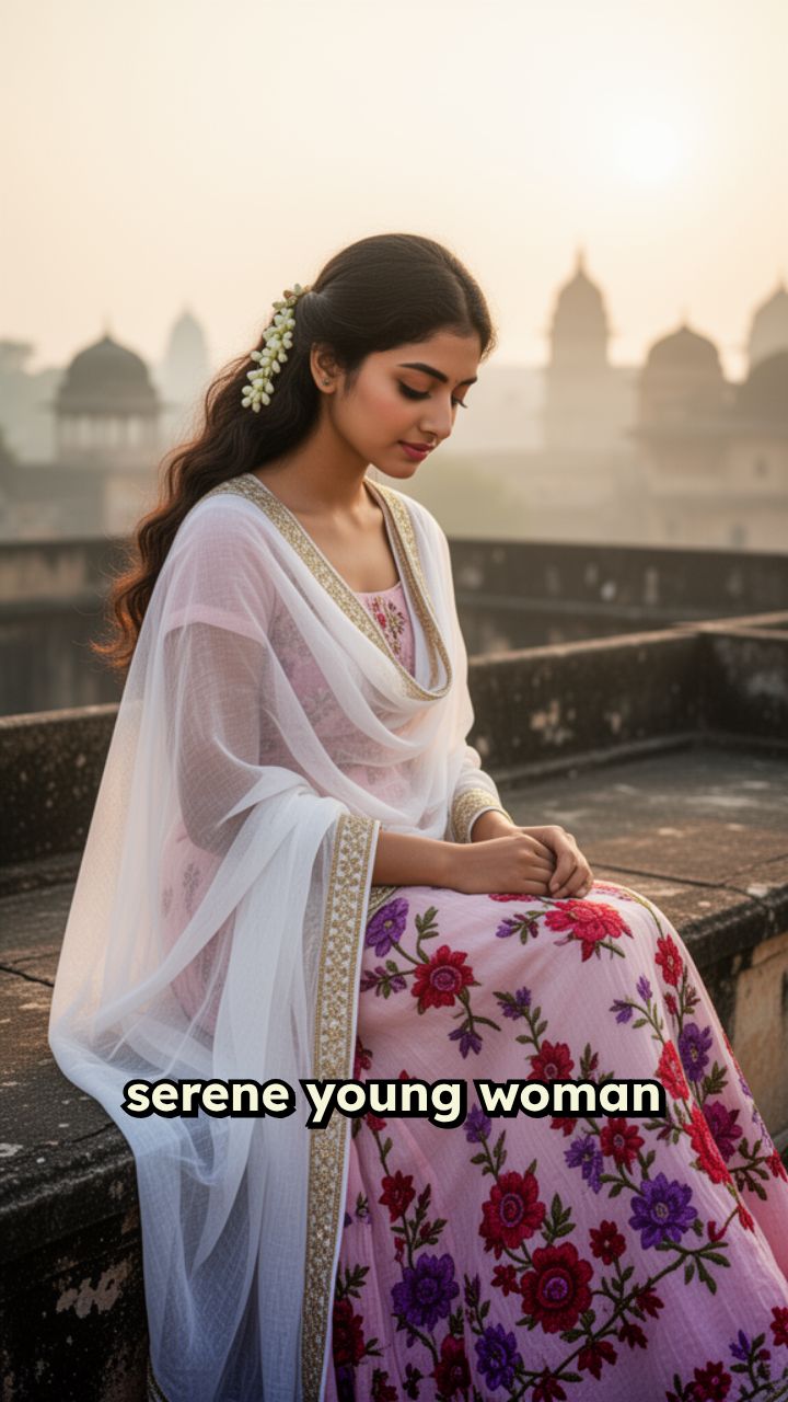 serene young woman in traditional white dupatta and floral embroidered dress, sitting on a rooftop