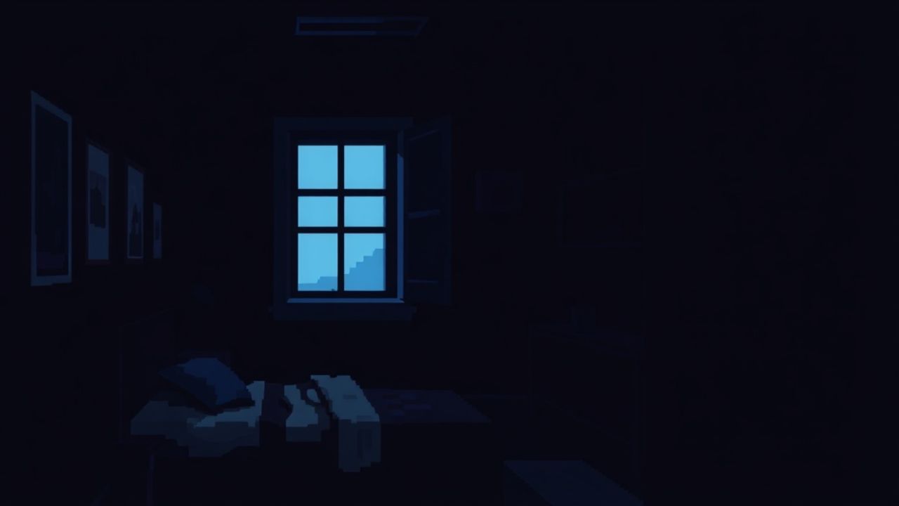 Scene 1 — Interior, quarto escuro, noite A small bedroom lit only by faint