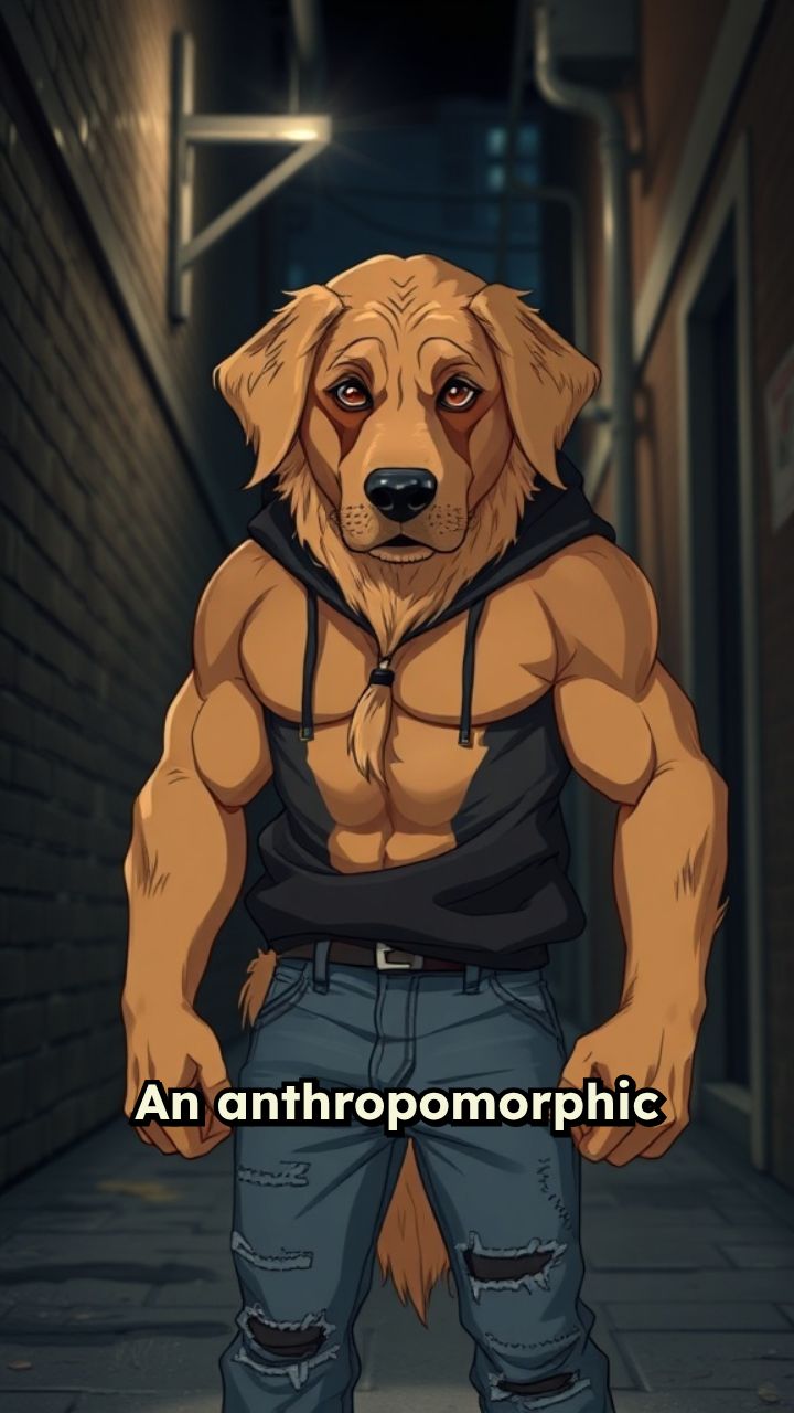 An anthropomorphic dog with a human muscular body, wearing streetwear hoodie and jeans,