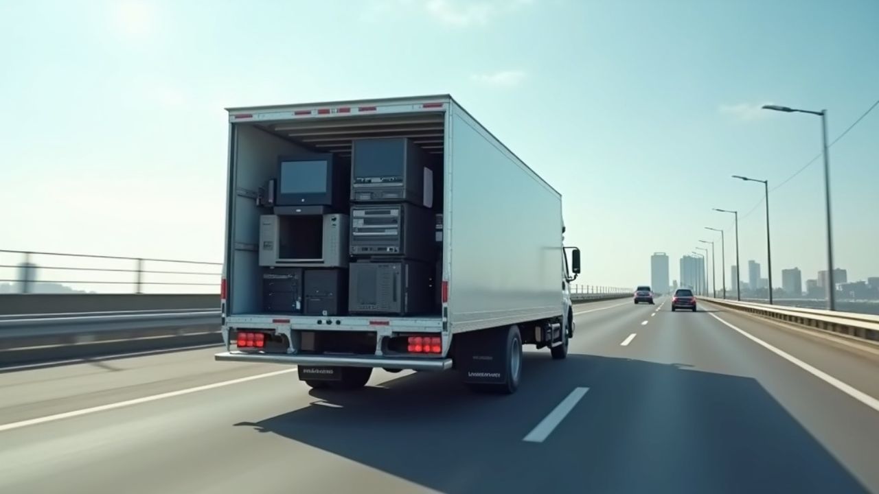Create a 10 second video where a van full of computers and screens is driving in highway.