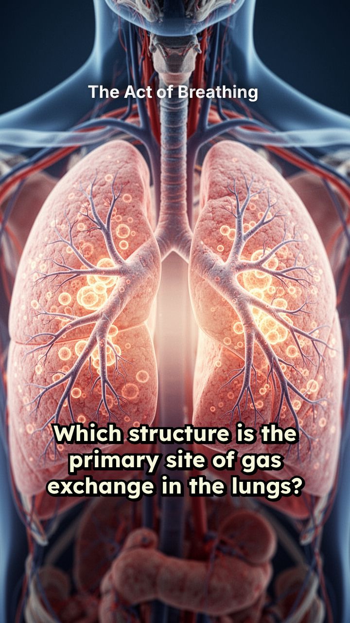Which structure is the primary site of gas exchange in the lungs? Which muscle is the main muscle of inspiration at rest? What is the correct order of airflow into the lungs? The “windpipe” that carries air to and from the lungs is the: Which structure prevents food from entering the airway during swallowing?