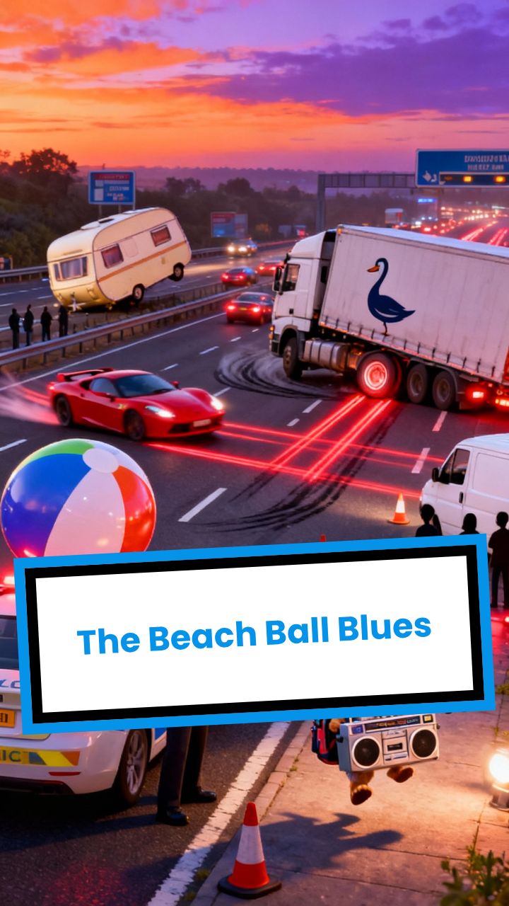 a slammed door. The giant beach ball rolls right into the motorway! Cars swerve!