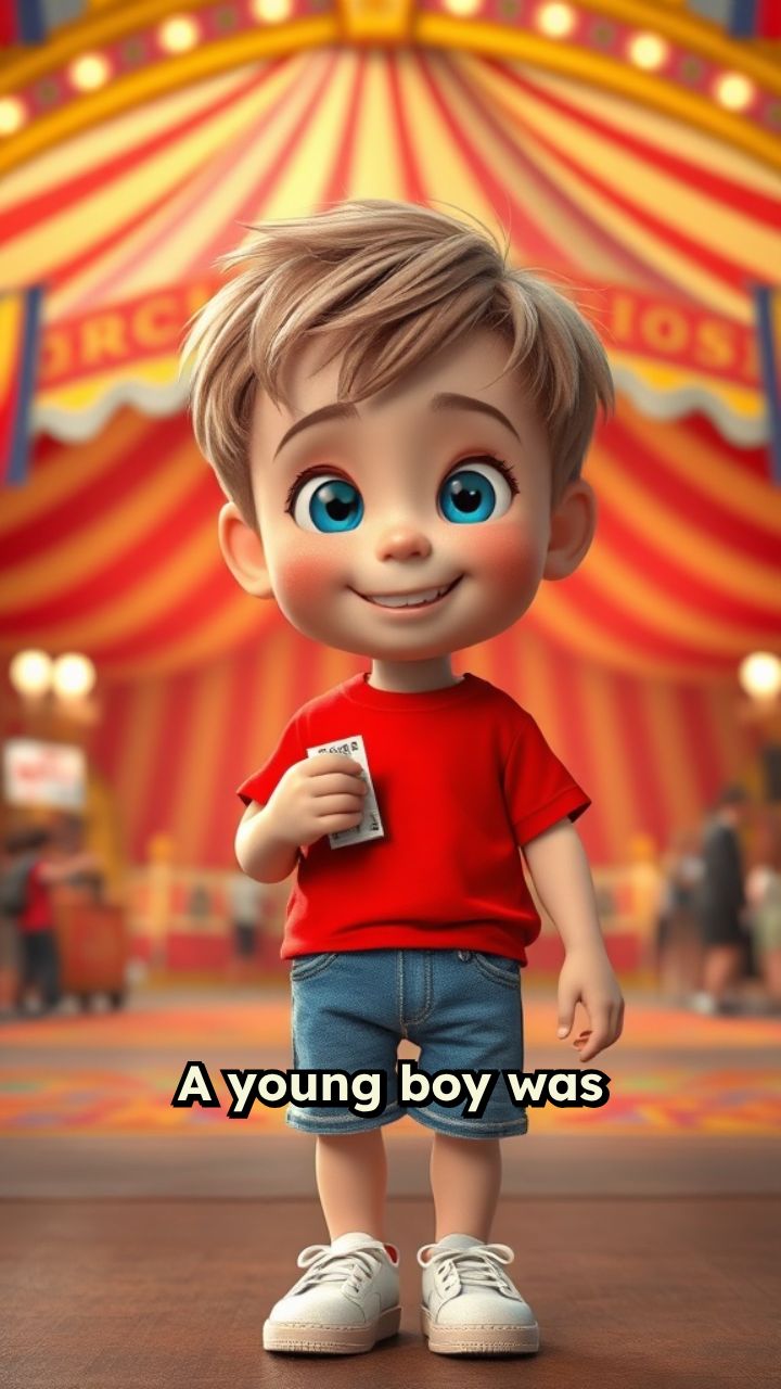 A young boy was walking he saw a circus he went inside the circus the boy bought tickets and