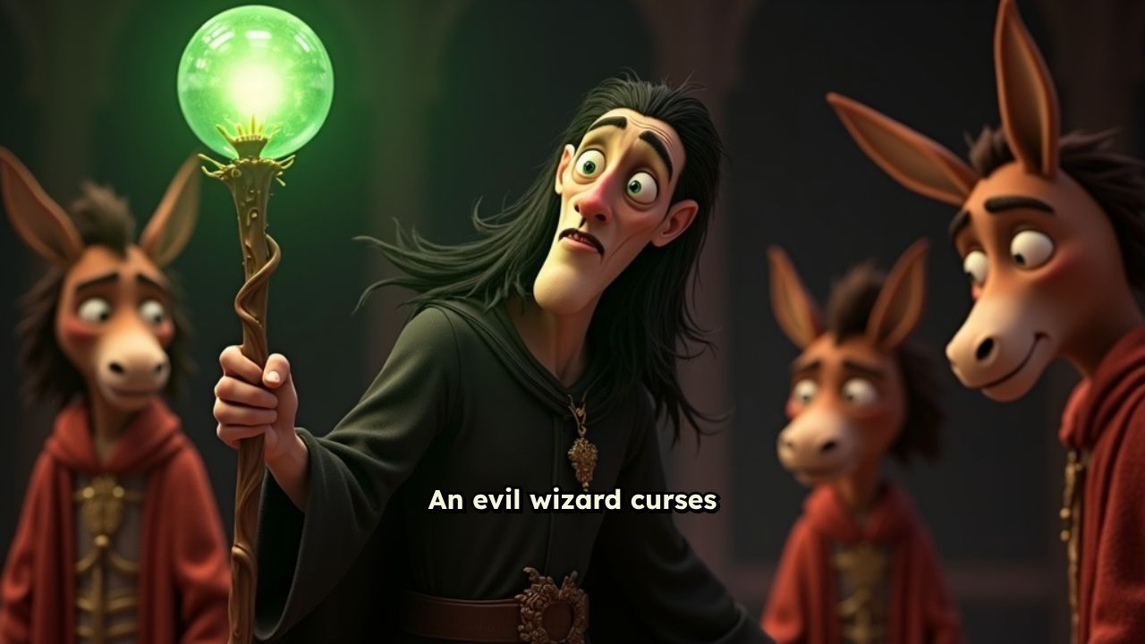 An evil wizard curses a nobleman’s three sons into turning into donkeys. The nobleman sends