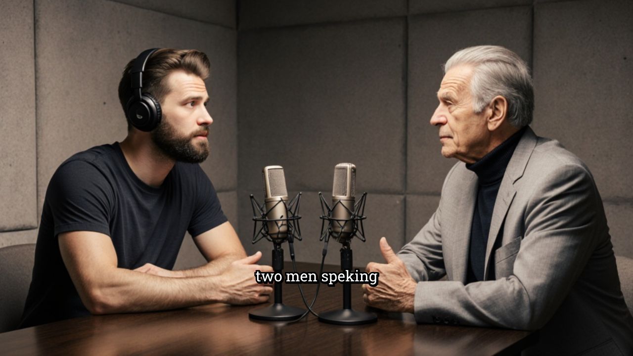 two men speking to each other like its a podcast the room is not too flasy but minimalistic