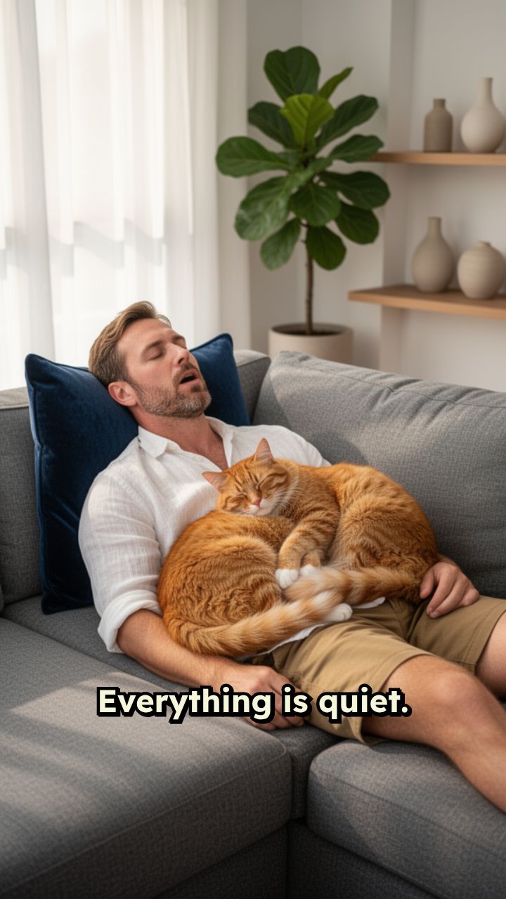 Everything is quiet. The owner and the cat are in a deep, peaceful sleep.