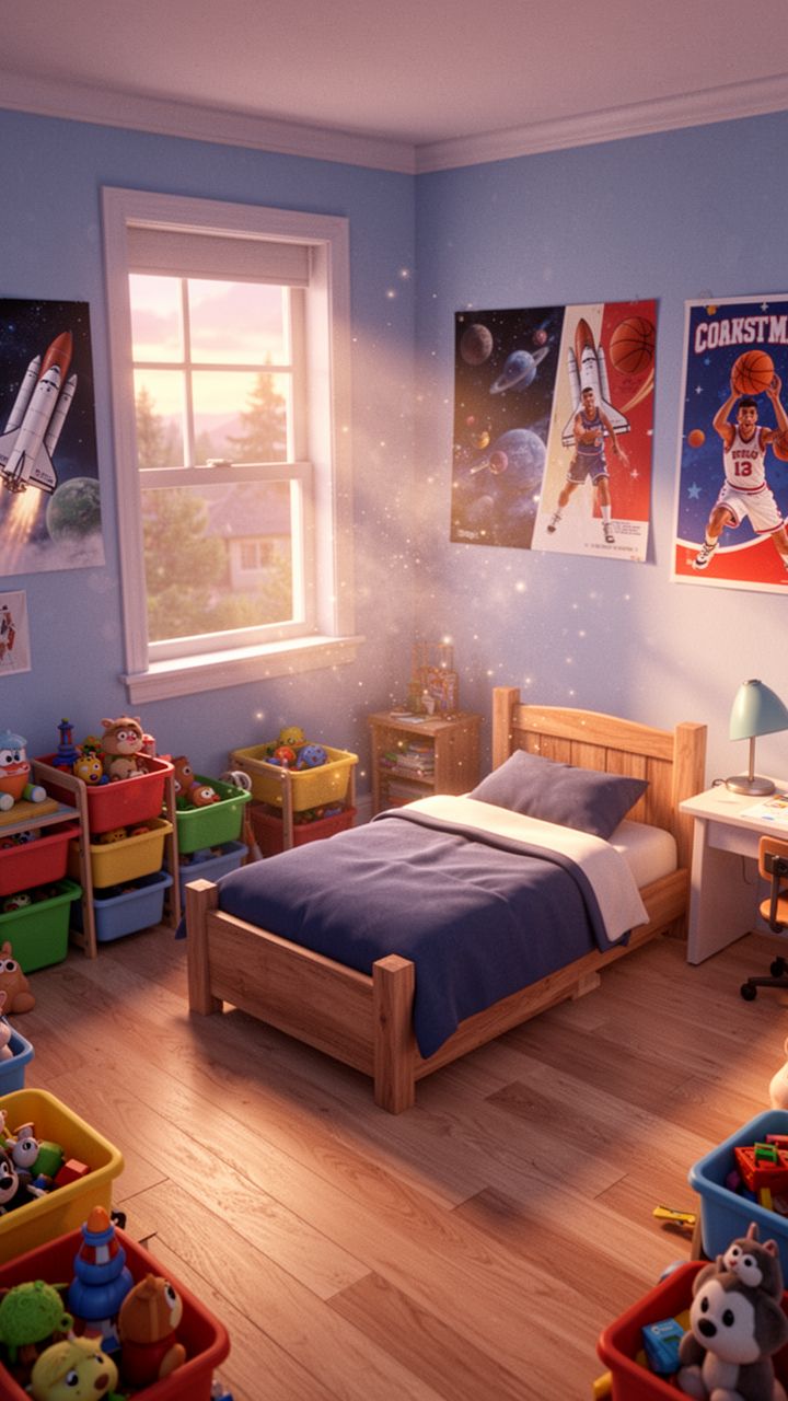 On his playground, whoa, dinosaurs are roaring. Monster trucks go crashing.