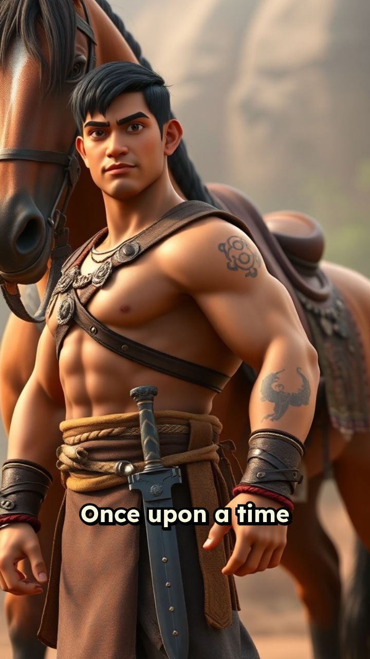 Once upon a time the man with a tattoo and long knife he stand beside of big brown horse,