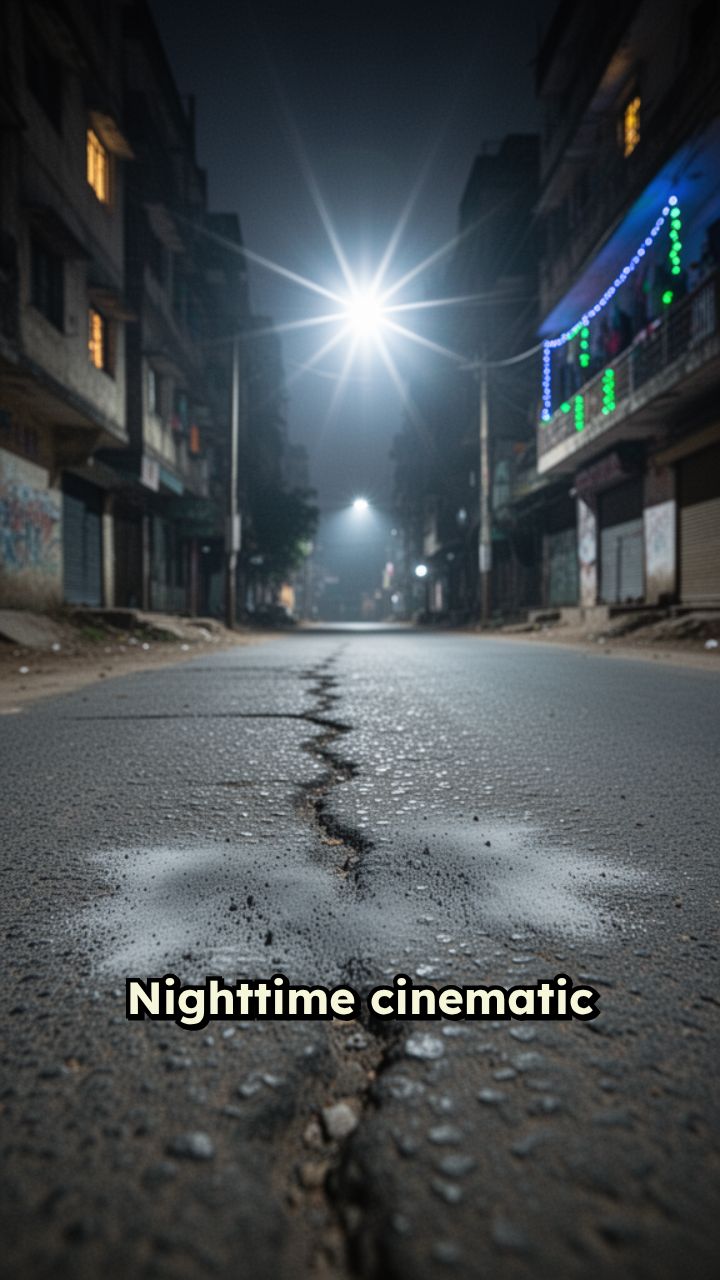 and worn asphalt texture. A harsh white Indian streetlight positioned behind the scene