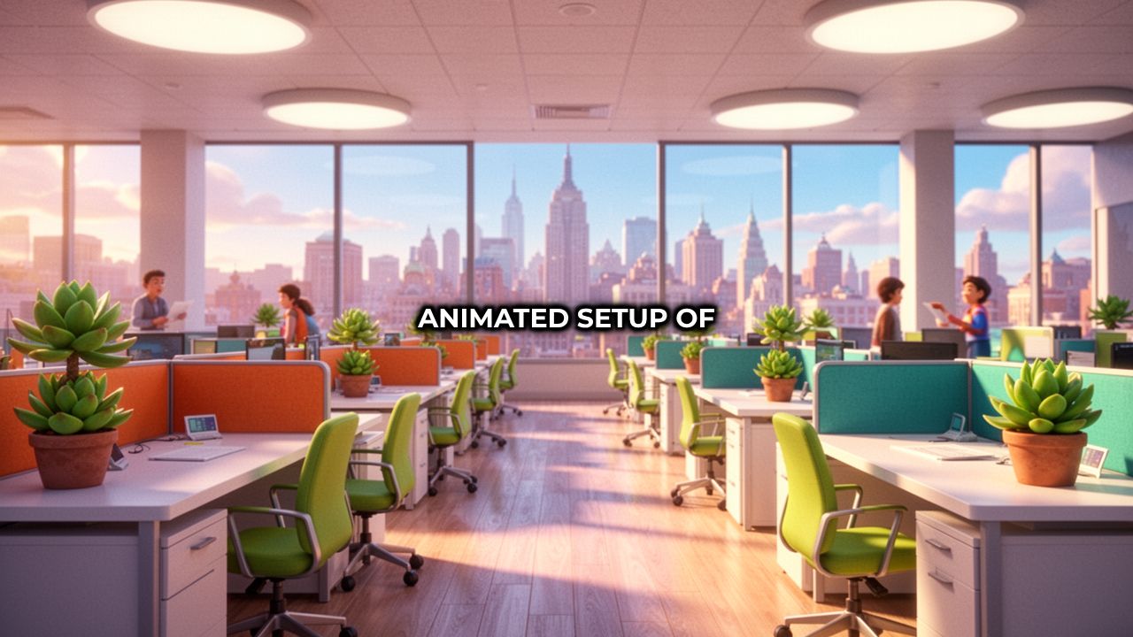 Animated setup of a cooporate office. An employee working hard on his system. A timer ticking