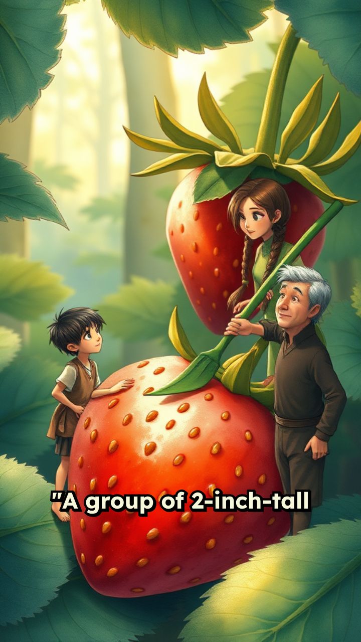 "A group of 2-inch-tall humans harvesting a giant strawberry in a glowing forest at golden hour,