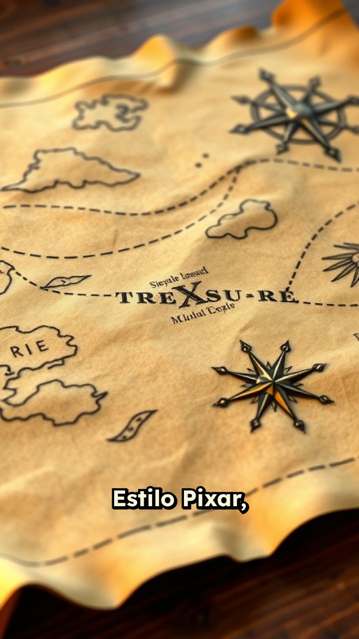 Estilo Pixar, 16:9. Primer plano del mapa del tesoro. Otra flecha mágica