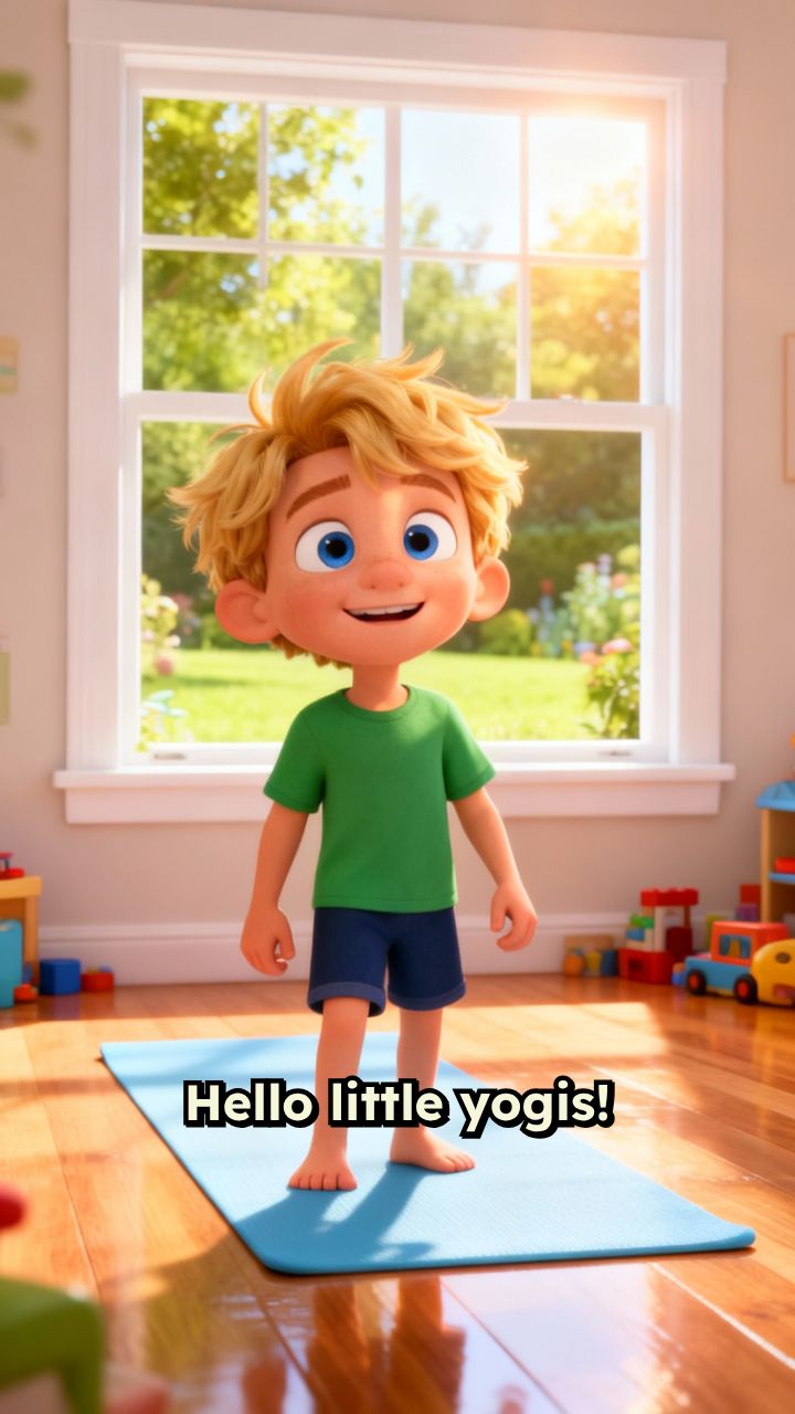 Hello little yogis! Today we are practicing Triangle Pose. Stand up tall with your feet wide apart.