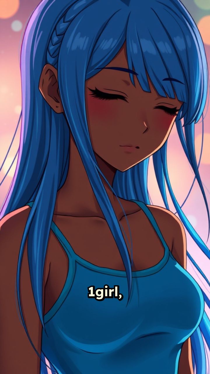 1girl, wearing blue tank top, long blue hair, closed eyelids because