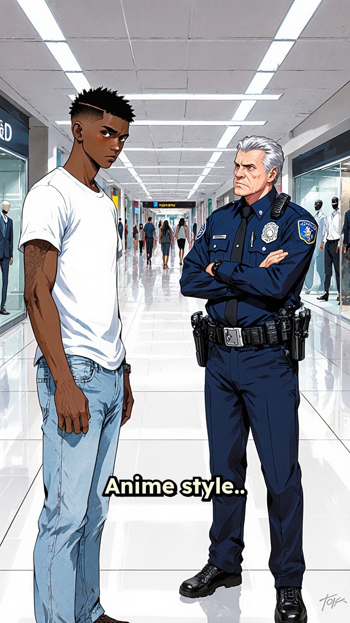 Anime style.. african american being questioned by police in a mall. Police officer: