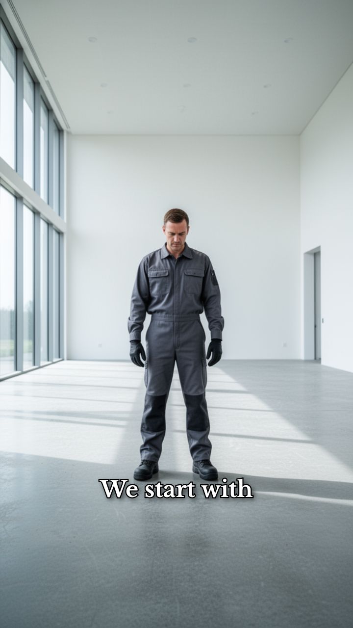 We start with a bare concrete hall. Workers place natural live-edge wooden slabs.
