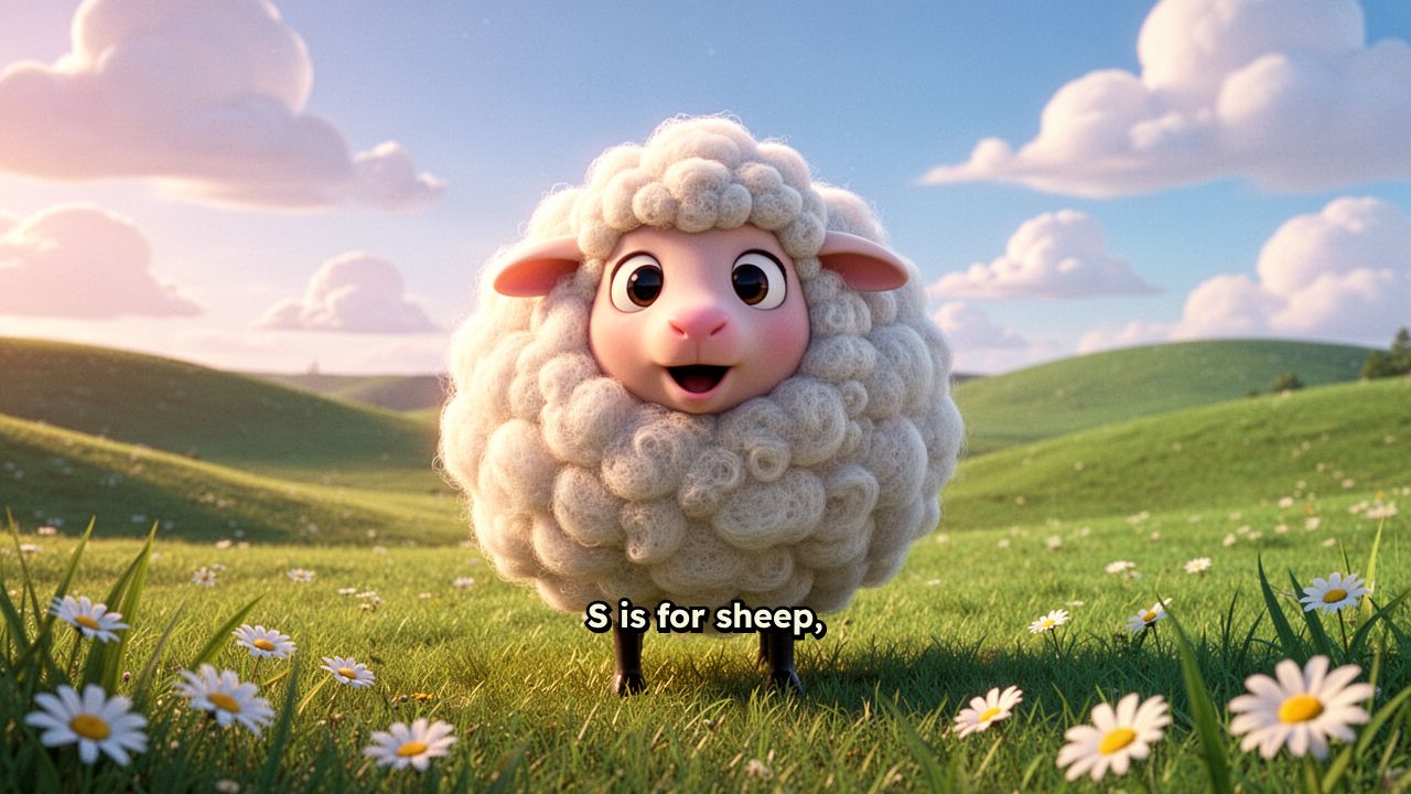 S is for sheep, fluffy white. Sheepie says, "Baa, baa."