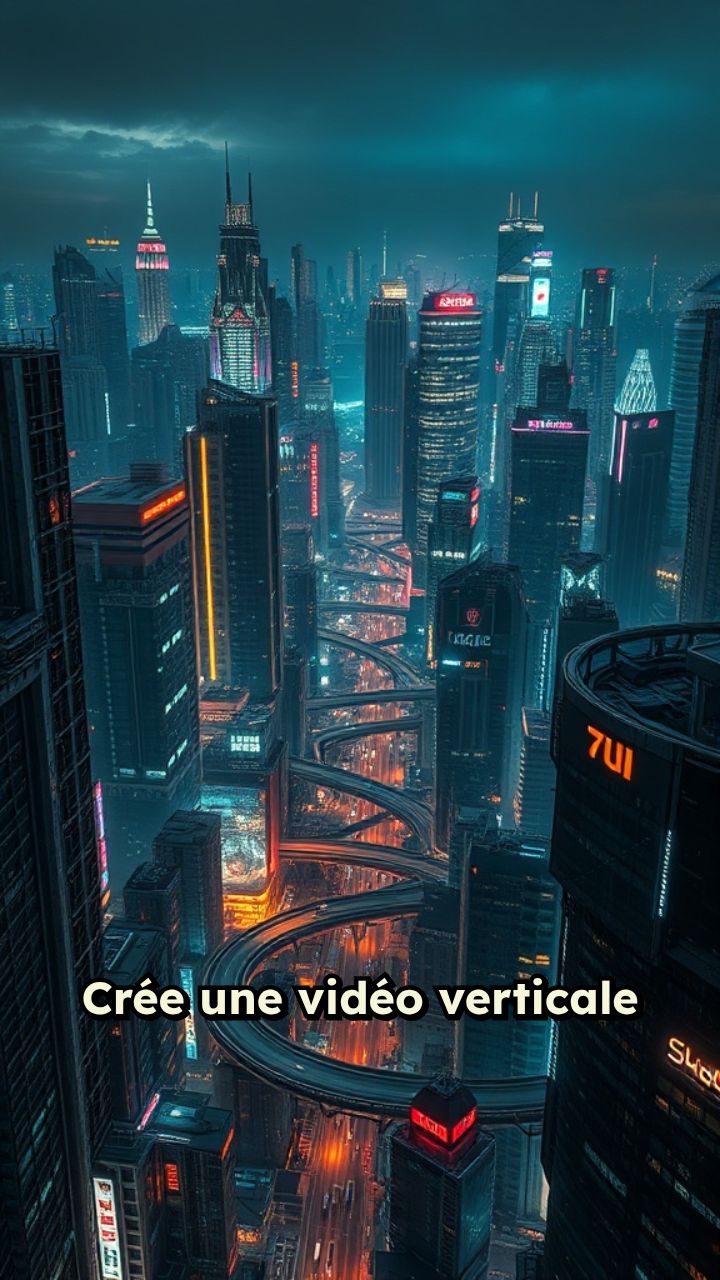 Crée une vidéo verticale 9:16 au style futuriste : ville cyberpunk, hologrammes, drones dans le ciel,