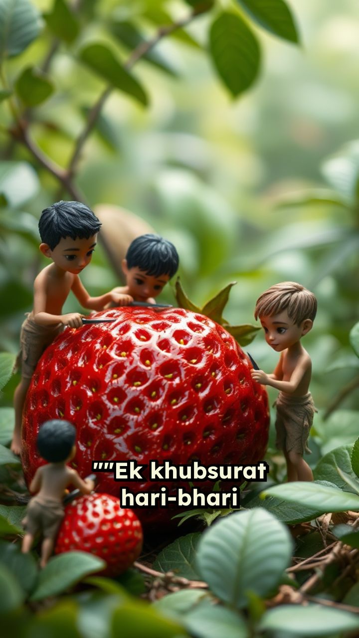 ""Ek khubsurat hari-bhari jungle mein, kuch 2-2 inch ke chhote insaan milkar ek vishaal strawberry