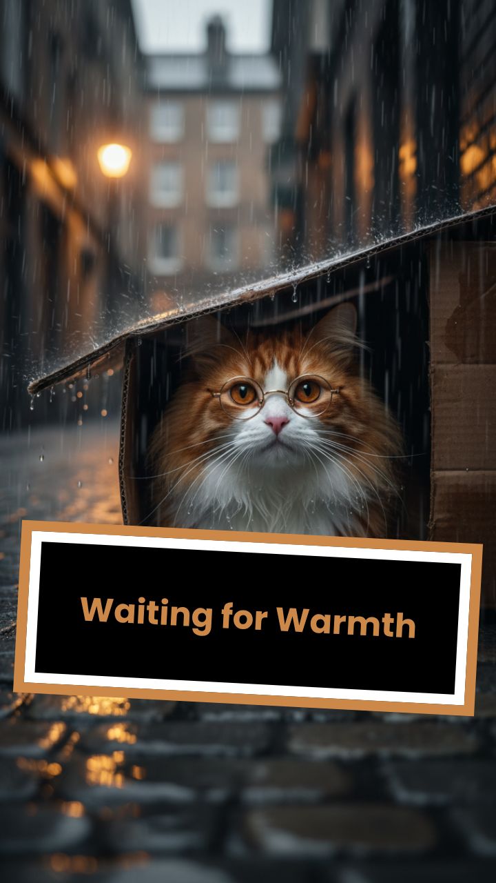 it. Audio/Narration: "…for a gentle hand or a kind voice." Scene 3 – Cat Curled Up Alone (10–15 sec) Visual: The cat curls into a tight ball in a cardboard box, looking tired but hopeful. Rain continues softly in the background. Audio/Narration: "Even in the quietest moments… hope never leaves them." Background music: Soft, slow piano chords, fading out as the video ends.