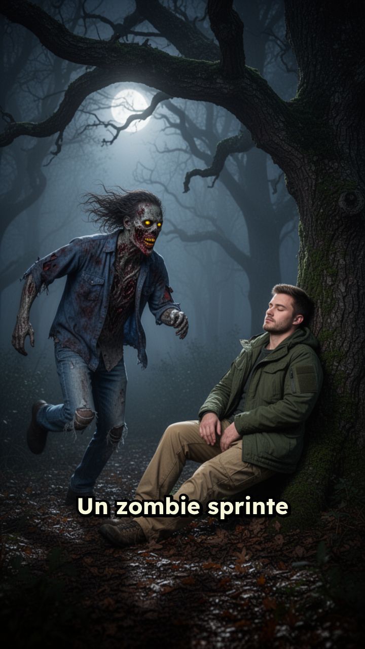 Un zombie sprinte à travers la forêt, repère un homme endormi sans défense. Il bondit,